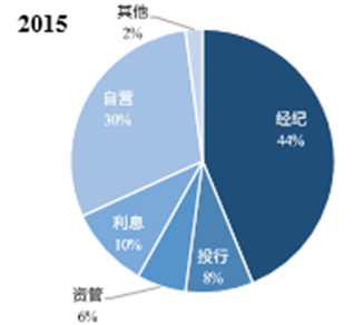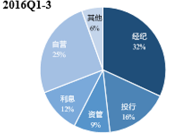 2、業務結構進一步均衡,投行比重顯著提升 業務收入結構來看,2016 年一季度市場波動導致前三季度經紀、利 息(兩融)、自營收入大幅下挫,經紀業務收入占比降至 32%,投行業務 收入占比提升至 16%,較 2015 年大幅提高 8 個 pct.,同時資產管理業務 收入占比提升至 9%,提高 3 個 pct.。市場波動、成交量同比銳減的環境 下,券商經紀、自營業務大幅下滑,業務結構被動優化并趨于均衡。
