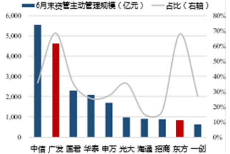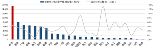 券商資管規模持續增長,未來加強主動管理提升業務價值。隨著泛 資管時代來臨,券商資產管理規模持續增長,根據證券投資基金業協會 數據,截至 9 月末,券商資管規模合計達到 15.8 萬億元,較 2015 年末增 長 33%。上市券商中,中信資產管理規模大幅領先其他券商,2016 年 6 月末達到 1.55 萬億,較 2015 年末增長 44.8%,同時,東北證券資產管理 規模較年初大幅增長 132.6%至 837 億元,增速顯著領先行業。 隨著監管政策強化對資產管理通道業務的限制,未來主動管理將成 為券商資管主流趨勢,同時更能發揮券商投研、產品設計等優勢,提升業 務價值及盈利能力。根據證券投資基金業協會數據,上市券商中,中信主 動管理資產規模最高,6 月末達到 5557 億元,占總規模比重為 35.8%, 同時廣發、東方主動管理規模占比領先行業,分別達到 68.5%、68.1%。