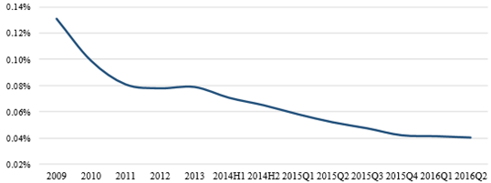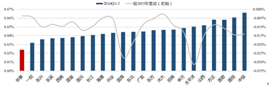 傭金率進一步下滑接近觸底,未來差異化戰略將成核心。近年來證 券行業傭金率持續下降,2016Q2 已降至 0.0405%。目前,雖然部分大型 券商憑借規模效應、成本管控、客戶粘性等競爭優勢,仍有空間進一步壓 低傭金率,但行業整體來看,傭金率已基本進入穩態,綜合考慮經紀業務 運營成本、利潤指標考核等因素,預計未來傭金率進一步下降的空間和動力有限。 上市券商中,華泰傭金率最低,2016Q1-3 降至 0.0244%,超出市場 預期,但 Q3 單季度傭金率環比略微提升,呈現觸底態勢。與之對比,國 君、中信等大型券商傭金率仍維持較高水準,體現綜合服務價值。預計未 來行業傭金率將分化,差異化戰略將成為經紀業務核心,各券商將設定 市場份額提升、體現綜合服務價值、低價放量等有差異的多元化目標。
