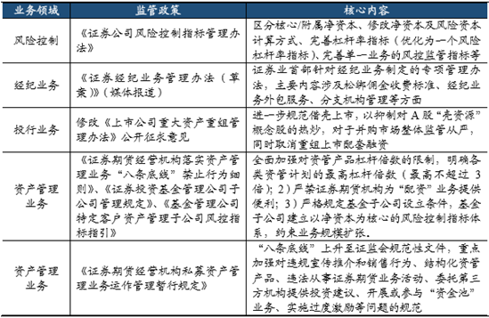3、監管體系推陳出新,夯實基礎前景光明 今年以來,證券行業監管政策體系全面推陳出新,包括風險控制管 理辦法、資管“八項新規”、經紀業務專項管理辦法、重大資產重組管理 辦法修訂等多項監管新規陸續出臺,從券商各業務線條到資本市場整體 均有新的適應當前環境的政策出臺。隨著監管升級,券商步入穩健發展 新時代,夯實基礎后長期將利好行業健康有序發展,此外,隨著未來金融 體制改革破冰,券商有望進一步拓寬業務范圍,行業前景光明。