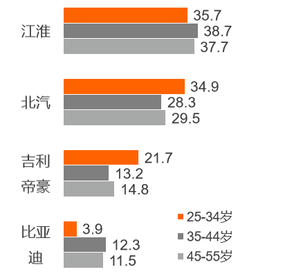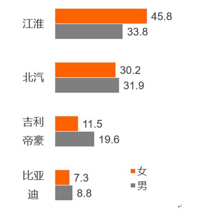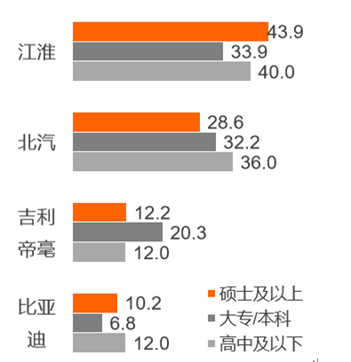 不同群體之間的品牌選擇存在差異: 女性群體和高學(xué)歷人群更偏愛江淮,北汽和吉利帝豪更受年輕人喜愛