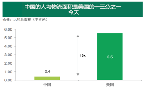 在數量上,中國日益增長的制造業進出口、零售及電商業務、相關第三方物流產業的巨大規模產生的物流需求與嚴重不足的社會物流供給相矛盾。據報告稱,目前我國的人均物流面積為 0.4 平方米,與美國的 5.5 平方米仍有約 13 倍的差距;在質量上,中國由整體產業化升級所導致的高端、智能化的現代化物流設施需求與總體上技術處于落后物流設備供給相矛盾。在市場上 6 億平方米的物流倉儲設施供給中,僅有五分之一為現代化倉儲物流設施,大部分仍為傳統模式下的物流設施,提供效率低下的物流服務。