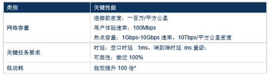 目前 5G 技術已經確定了 8 大關鍵能力指標:峰值速率達到 20Gbps、用戶體驗數據率達到 100Mbps、頻譜效率比 IMT-A 提升 3 倍、移動性達 500 公里/時、時延達到 1 毫秒、連接密度每平方公里達到 10Tbps、能效比 IMT-A 提升 100 倍、流量密度每平方米達到 10Mbps。