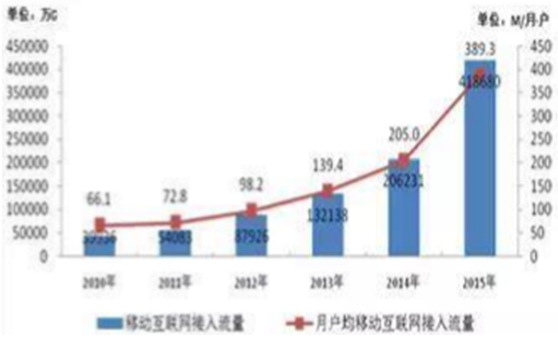 中國 2010-2015 年移動互聯網流量發展情況
