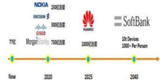 物聯網擴展了移動通信的服務范圍,從人與人通信延伸到物與物、人與物智能互聯,使移動通信技術滲透至更加廣 闊的行業和領域。面向 2020 年及未來,移動醫療、車聯網、智能家居、工業控制、環境監測等將會推動物聯網應 用爆發式增長,數以千億的設備將接入網絡,實現真正的“萬物互聯”,并締造出規?涨暗男屡d產業,為移動通 信帶來無限生機。同時,海量的設備連接和多樣化的物聯網業務也會給移動通信帶來新的技術挑戰。世界各大咨詢 機構及廠商都發布了對未來物聯網連接數的預測,其中,孫正義在軟銀的投資報告中認為 2040 年,每個人將擁有 1000 個連接設備,按照全球 100 億人口估算,將會帶來 10 萬億的連接數。