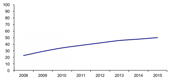 2008-2015中國互聯(lián)網普及率(%)