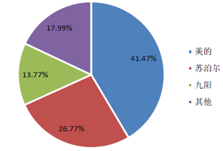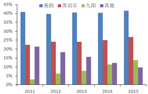 在國內電飯煲市場上,目前呈現美的、蘇泊爾、九陽三家獨大的行業局面。美的電器作為國內起步較早的家電龍頭企業,產品覆蓋面廣,營銷渠道成熟,品牌優勢大,近年來其在電飯煲領域平均市占率一直穩定在40%左右。蘇泊爾在小家電領域深耕多年,其飯煲類產品也一直進行更新升級,近5年的市場占有率穩中有升。九陽從豆漿機起家,從2011年開始發力電飯煲市場,其電飯煲市場占有率由2011年的2.98%快速提升至2015年的13.77%。公司的戰略層面也從“九陽=豆漿機”往“九陽=品質生活小家電”方向邁進。
