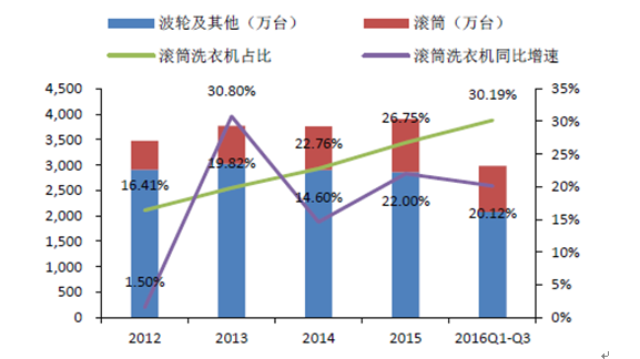 滾筒洗衣機(jī)產(chǎn)量占洗衣機(jī)總產(chǎn)量比重逐年提升