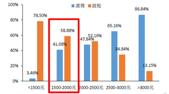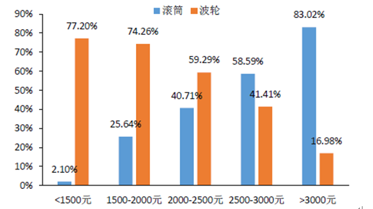 2016年1-10月不同價(jià)格段內(nèi)滾筒與波輪零售量占比