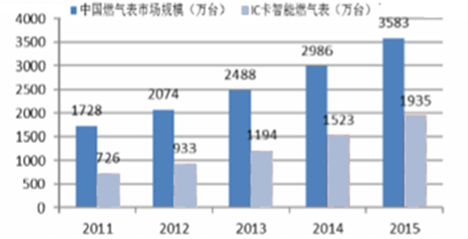 2011-2015年中國燃?xì)獗砑癐C卡智能燃?xì)獗硎袌鲆?guī)模