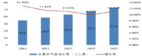 根據(jù)《全國城鎮(zhèn)燃?xì)獍l(fā)展“十二五”規(guī)劃》,“十二五”期間,我國新建城鎮(zhèn)燃 氣管道約25萬公里,到“十二五”期末,城鎮(zhèn)燃?xì)夤芫W(wǎng)總長度達(dá)到60萬公里。目前我國已經(jīng)形成了以西氣東輸、川氣東送、陜京一二線、忠武線、澀寧蘭線以及冀 寧線、淮武線為主框架的全國性天然氣干線網(wǎng),截至2016年6月末,全國已經(jīng)形 成一張橫貫東西、縱貫?zāi)媳钡奶烊粴饣A(chǔ)管網(wǎng),覆蓋全國31個省份,95%以上的 地級市均用上了天然氣。“十三五”期間,將進(jìn)一步完善天然氣管網(wǎng),規(guī)劃建設(shè)陜京四線、西氣東輸四線、中俄東線、新疆和內(nèi)蒙古煤制氣外輸管道等多條干線管道,基本建成調(diào)度靈活、供應(yīng)穩(wěn)定的全國性管網(wǎng)輸送體系,從而為天然氣的大規(guī) 模利用提供強有力的保障。