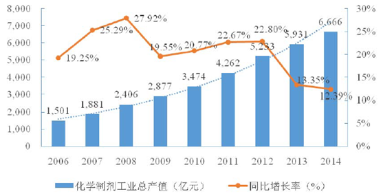 2006-2014 年我國化學(xué)制劑工業(yè)總產(chǎn)值走勢圖