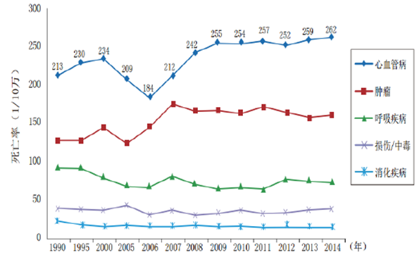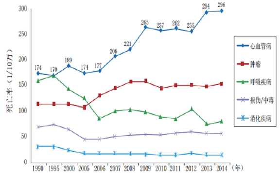 1990~2014年中國(guó)城市居民主要疾病死亡率變化