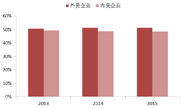 2013-2015年降壓藥內(nèi)外企業(yè)銷(xiāo)售占比