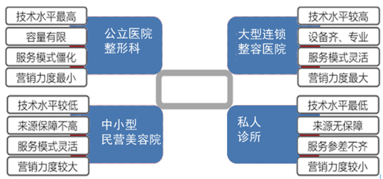 目前全國約有超過 24000 家各類醫療美容機構及診所,按 2013 年收入計算,還沒有市場 份額超 5%的整形美容機構,行業集中度很低。目前市場參與者主要包括公立醫院醫療美 容科、民營連鎖機構、民營單一門店及各式美容院,質量良莠不齊。