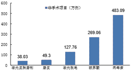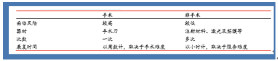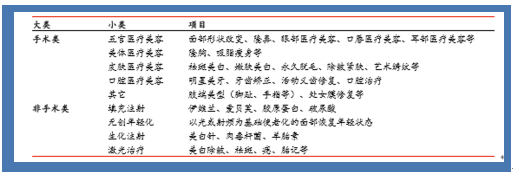 非手術類項目將是醫美行業中的閃亮明星 醫療美容項目主要分為手術類與非手術類。手術類的經典項目包括面部手術(眼部、鼻部 等)、美體手術(胸部、瘦身)等,對手術技術要求較高,國內一般納入“美容外科”;非 手術類,是指不需開刀,對身體進行精準微調,包含微創美容類(注射玻尿酸、肉毒素等)、 皮膚美容類(激光、熱瑪吉、磨皮等),一般納入“美容皮膚科”統一管理。