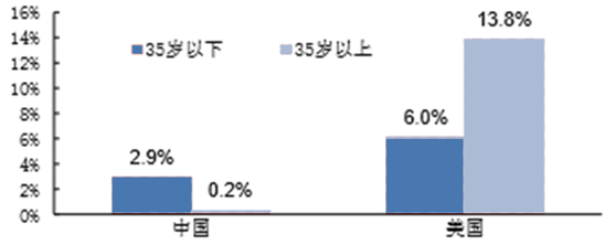 中國 35 歲以上接受整形的滲透率遠遠低于美國(2015 年)