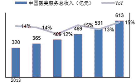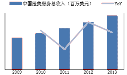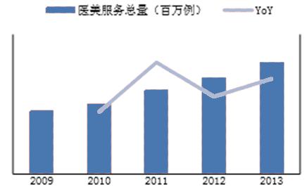 據 Frost & Sullivan 數據顯示,中國醫美服務量已由 2009 年的 270 萬例增長至 2013 年的 480 萬例,年復合增長 15.5%, 而醫美服務總收入則由 2009 年的 27 億美元增長至 2013 年的 41 億美元,年復合增長率 14.2%,行業熱度持續提升。