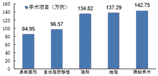 目前主流的手術類項目主要包括面部手術(眼部、鼻部) 和美體手術(胸部、瘦身),據 ISAPS 數據顯示,2014 年全球最受歡迎的美容手術項目 排名前五的分別是眼瞼手術、抽指術、隆胸術、自體脂肪移植、鼻整形術,合計占比接近 60%。近年雖然手術類項目占比在逐漸下降,但行業需求還在穩步增長,而且單價相對較 高,故收入規模未來 3-5 年還將占行業主導,預計 2018 年手術類項目的規模能達 56.42 美金,占比高達 62%。