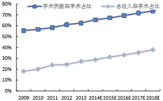 近年我國醫美行業持續升溫,2013 年市場規模已達 41 億美元,2009-2013 年醫美服務 CAGR 達 15.5%。基于我國醫美行業有滲透率低,消費意識持 續提升,年齡譜不斷拓寬等特點,未來 3-5 年我國醫美行業有望繼續保持 高增長態勢,預計 2018 年醫美市場規模將達 91 億美元,年服務量突破千 萬。具體到細分領域,非手術類項目由于其高安全性,增速將高于行業整 體增速,2018 年非手術量占比預計將達 74%(13 年為 63%);手術類項 目占比雖然在下降,但在臉部、胸部及抽脂等領域還將保持穩定增長,且 單價較高,故 2018 年手術類規模占比依舊能達 62%(13 年為 73%)。