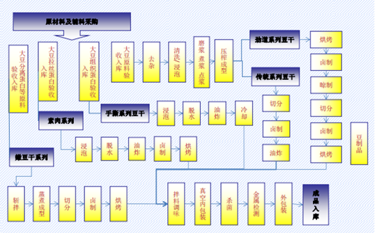 核心提示:1、豆制品的工藝流程圖2、魚豆腐的工藝流程圖3、蜜餞產品的工藝流程圖4、堅果炒貨的工藝流程圖5、休閑肉制品的工藝流程圖6、休閑素食的工藝流程圖1、豆制品的工藝流程圖