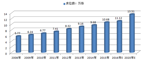 為了滿足不斷增長的就醫需求,我國醫療機構的服務能力也在不斷提升。根據國家統計局的數據顯示,2008年我國醫院床位數為288.3萬張,2015年達到533.10萬張。預計2020年我國醫院床位數將達到659.82萬張,期間復合增長率為10.90%。病區床位數量的不斷增長和病區醫護工作工作量的不斷增加都對病區信息化支持提出了更多的需求。