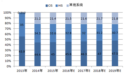 隨著我國新醫療改革的深入發展,對醫療信息化建設的投入力度也不斷加大。我國醫院經歷了2003年后HIS的建設熱潮后,其基礎業務平臺已逐步成型,HIS系統占醫療行業總體解決方案的比例分別由2013年的35%變為2014年的34.3%,HIS系統占比略有下降。至2014年,CIS系統在醫療信息化解決方案中占比44.4%,HIS系統占比34.3%。預計2014年至2019年,CIS系統的年復合增長率為23.24%,高于HIS系統的18.80%。