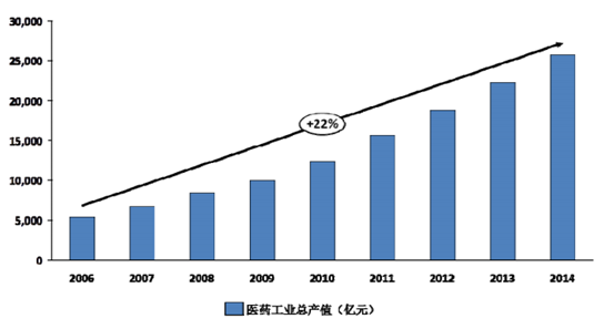 近十年來,受到國內居民生活水平持續提高、醫療保障制度改革不斷深化、人口老齡化現象日益顯著等因素的影響,國內醫藥產業整體步入高速增長階段,“十一五”期間,醫藥工業總產值的年度復合增長率為 23.31%,遠高于GDP 增速和全國工業平均增速。“十二五”期間,國內醫藥工業繼續保持快速增長的勢頭,2014年國內醫藥工業總產值達25,798億元,同比增長15.70%。作為全球藥品消費增速最快的地區之一,中國有望在 2020 年之前成為僅次于美國的全球第二大藥品市場。