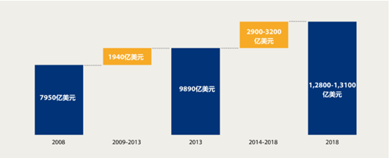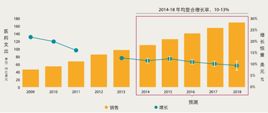至 2018 年,受到人口增長、人口老齡化以及新興醫藥市場醫療普及情況提高等因素的影響,全球醫藥總支出預計將達1.28-1.31萬億美元,相比2013年增加 2,900-3,200億美元。