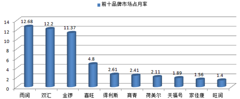 2015年,我國(guó)低溫肉制品行業(yè)市場(chǎng)份額排名前十品牌分別為:雨潤(rùn)、雙匯、金鑼、喜旺、得利斯、育靑、荷美爾、天福號(hào)、家佳康和旺潤(rùn)。從品牌監(jiān)測(cè)情況來(lái)看,雨潤(rùn)、雙匯和金鑼為最熱銷(xiāo)的三大品牌,低溫肉制品市場(chǎng)前十品牌市場(chǎng)占有率達(dá)55%左右,市場(chǎng)集中度較高。