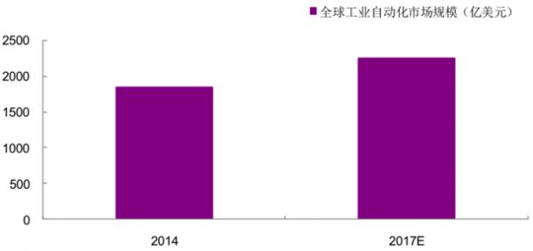 全球工業自動化市場空間超萬億。據預測,全球工業自動化設備行業2014 年營收達到 1853 億美元,預計到 2017 年全球規模將達到 2250 億美元。工業自動化市場規模巨大,并且在智能制造的大趨勢下,規模有望不斷擴大,為相關企業的發展提供了廣闊的發展空間。