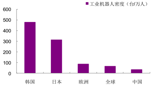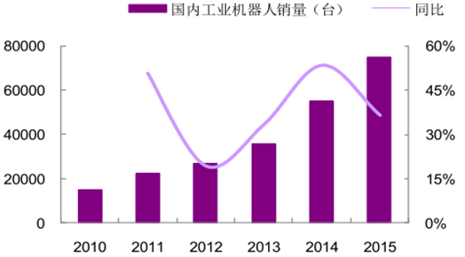 《中國制造 2025 》著力推進智能制造,潛力巨大 。我國在 2015 年 5 月發布了《中國制造 2025》,作為我國實施制造強國戰略第一個十年的行動綱領。截至2015年國內工業機器人銷量達到75000臺,約占同期全球銷量的30%,2010-2015 年銷量復合增長率為 38%,增長迅速。但是截至 2014 年,全球工業機器人保有密度為 66 臺/萬人,而中國僅有 36 臺/萬人,與全球平均水平相比,中國工業機器人有較大的發展空間,隨著政策的加碼,國內工業機器人未來發展潛力巨大。