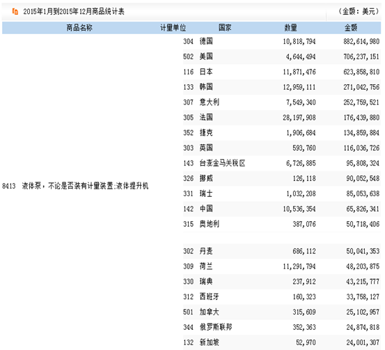 根據中國海關數據顯示,2015年我國泵進口主要國家及地區分析如下: