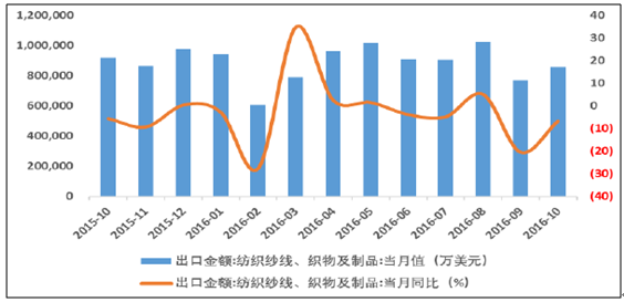 紡織紗線、織物及制品月度出口額1-10月份累計同比下降4.4%,降幅較去年同期降幅擴大2.5個百分點,較今年上半年降幅擴大2.7個百分點。其中9、10月份出口額同比降幅為20.44%、6.69%。