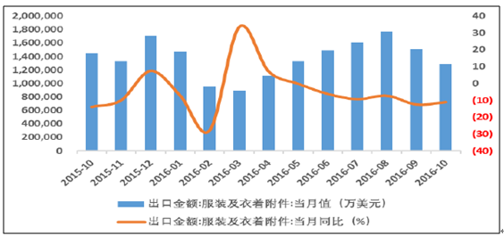 服裝及衣著附件子行業的出口形勢仍然處于弱勢,1-10月份月度出口金額累計同比增幅為-8.8%,較去年同期累計降幅擴大1.3個百分點,較上半年累計降幅擴大3.4個百分點,其中9、10月份同比降幅達到12.56%、11.12%。