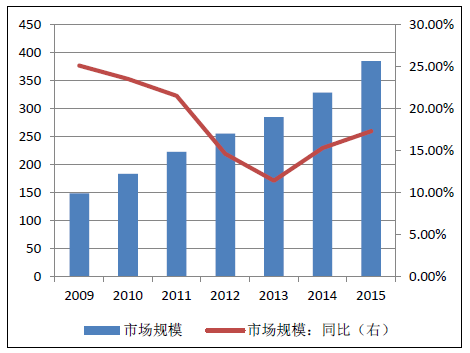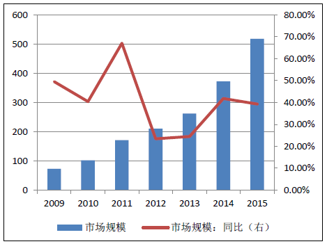 2015年中國IDC市場延續了高速增長態勢,市場總規模達到518.6億元人民幣,同比增長39.3%。2012、2013年IDC市場增速明顯下滑。2014年政府加強政策引導,開放IDC牌照,同時移動互聯網、視頻、游戲等新興行業發展迅速,推動IDC行業發展重返快車道,市場規模提升到372.2億元,增長41.8%。2015年,政策導向已初步見效,寬帶提速以及互聯網行業的快速增長,促使IDC行業高速發展,整體市場增速平穩在40%左右。