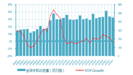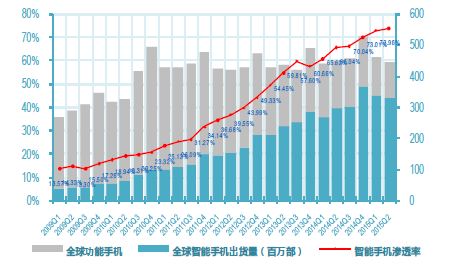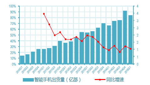 2010-2016年全球智能機季度出貨量及增速(百萬部)