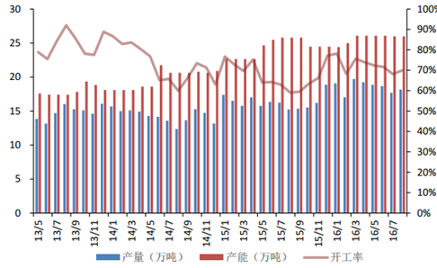 截止至 2016 年 8 月底,國(guó)內(nèi)環(huán)氧丙烷總產(chǎn)能達(dá) 305.7 萬(wàn)噸/年,產(chǎn)量為 148.2 萬(wàn)噸,同 比增長(zhǎng) 13.9%,裝置平均開工率 72.7%;1-7 月份環(huán)丙凈進(jìn)口量 20.4 萬(wàn)噸,較 2015 年同比 增長(zhǎng) 10.3%。當(dāng)前采用 HPPO 法的吉林神華裝置因催化劑問(wèn)題停車,重啟一再拖后;另一 采用 HPPO 裝置的中石化長(zhǎng)嶺裝置也處于持續(xù)停車狀態(tài);再除去其他部分開車不穩(wěn)定的氯醇 法產(chǎn)能,當(dāng)前實(shí)際有效產(chǎn)能在 249.5 萬(wàn)噸左右,平均開工率接近 90%,供需總體偏緊。