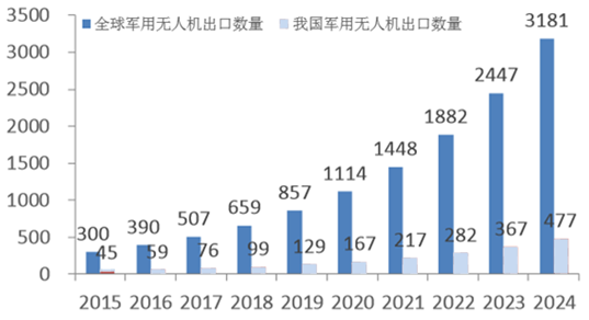 未來十年全球和我國(guó)軍用無人機(jī)出口數(shù)量預(yù)測(cè)(架)