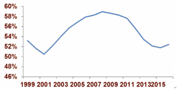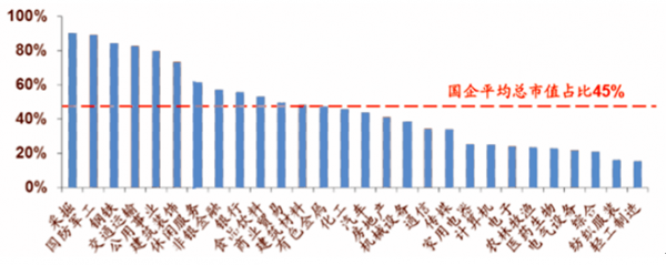 截止2016年10月底, A股各行業國有企業總市值占比平均為45%;國有資本在采掘、國防軍 工、鋼鐵、交通運輸、公用事業、建筑裝飾等壟斷性領域占有絕對的主導 地位。