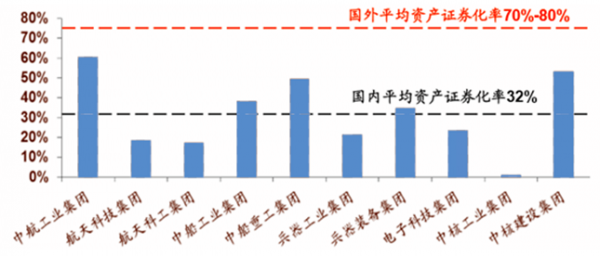 我國軍工企業證券化率 較低,截止2016年10月底,十大軍工集團證券化率約32%,而國外軍工 企業資產證券化率約為70%-80%,相比之下我國軍工企業潛在資產證券 化的空間巨大。目前已上市的軍工企業可能成為軍工資產注入的資本運作 平臺,從而釋放出巨大制度紅利。