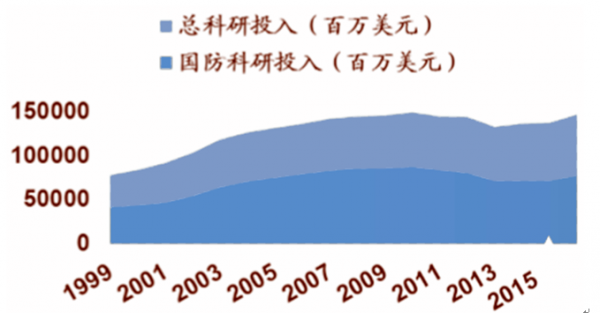 十五年來,美國科研投入中,平均有55%直接用于國防科研,該比重最高 達到58.2%。