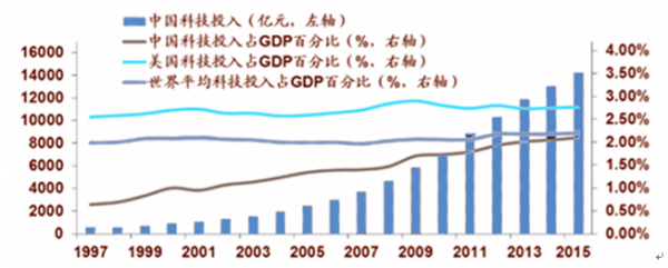 我國的科研投入增速逐年上升,增勢強勁。 2014年科技投入為13015.6 億元,預計2020年科技投入將達到23175億元,占GDP比重2.5%。