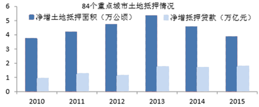2015 年, 全國重點 84 個城市的凈增土地抵押貸款為 1.78 萬億元,包括但不限于企業(yè)抵押,以及政 府城投和建投等融資平臺。
