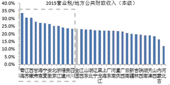 2015 年全國國有土地使用權(quán)出讓收入 3.3 萬億元,是營業(yè)稅總額 1.1 萬億元的 3 倍,營業(yè) 稅的減少可以通過土地出讓收入補充,而這對營業(yè)稅在當?shù)刎斦杖胝急容^大的省市更加 明顯。2015 年全國營業(yè)稅占地方公共財政收入的 23%,全國 12 個省直轄市高于該水平, 其中北京、福建、江蘇、浙江、安徽屬于房地產(chǎn)市場和土地市場的熱點領(lǐng)域,至于青海、 西藏、甘肅、寧夏等省將主要依賴于中央的轉(zhuǎn)移支付。預(yù)計熱點一二線城市所在省市 未來將加大土地供給,而熱點省市的土地市場回暖將一定程度上帶動房地產(chǎn)投資。