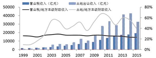 1999 年以來土地出讓收入占地方本級財政收入比例逐漸提高,2015 年占比 39%