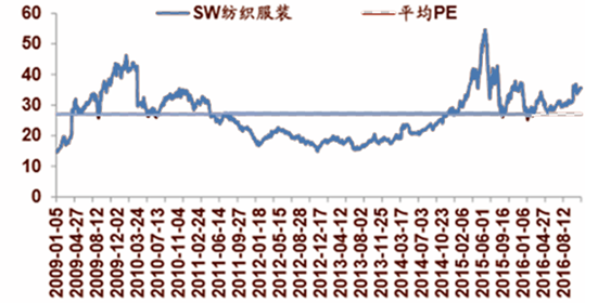 2016Q3紡織、服裝分化 •服裝家紡凈利增速0.03%,低于2015年15.36%;紡織制造14.51%,較 2015年-18.53%改善明顯。 •截止11月18日,紡織服裝板塊TTM估值35.5倍,高于2009年以來的27.0 倍的歷史平均水平。