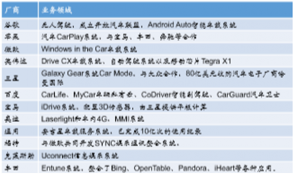 在具體的動作方面,不僅傳統(tǒng)的汽車廠商如寶馬、福特、通用等加快車聯(lián)網(wǎng)產(chǎn)品的 開發(fā)和推廣,IT 科技公司如谷歌、蘋果、微軟、英偉達也在快速布局。而且互聯(lián)網(wǎng)公司 紛紛選擇與汽車廠合作,合力研發(fā)的系統(tǒng)打入前裝市場,從而更好的占領(lǐng)制高點。
