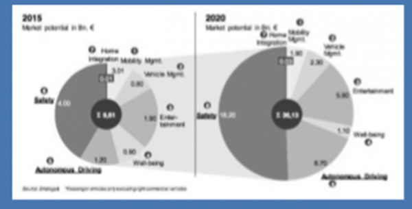 在全球 范圍內(nèi),車聯(lián)網(wǎng)中最大的三塊:一個是安全,主要是指車身安全;第二是自動駕駛;第 三是娛樂系統(tǒng),預(yù)計未來五年都是高速增長。如安全將從 2015 年的 121.8 億歐元增長 至2020年的473.4億歐元,自動駕駛將從2015年的74.9億歐元增長至2020年的356.6 億歐元。整個全球車聯(lián)網(wǎng)總市場將從 2015 年的 318.7 億歐元增長至 2020 年的 1152.0 億歐元,復(fù)合年均增速高達 29.3%。