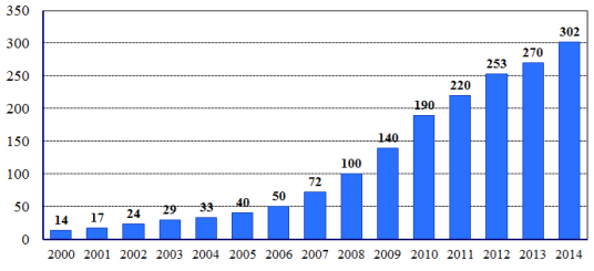 2000-2014 年中國 LED 全彩顯示屏市場規(guī)模 (單位:億美元)